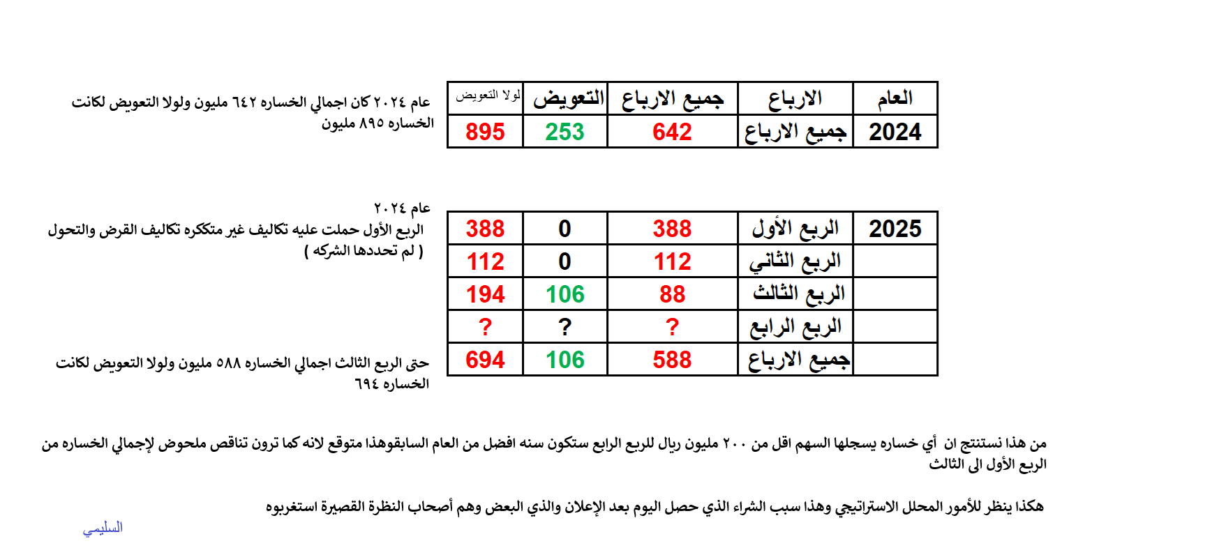 خسائر هذا الربع الفعلية 442 مليون ريال وليس 336 مليون بسبب دخول مبلغ 106 مليون مبالغ تأمينية .