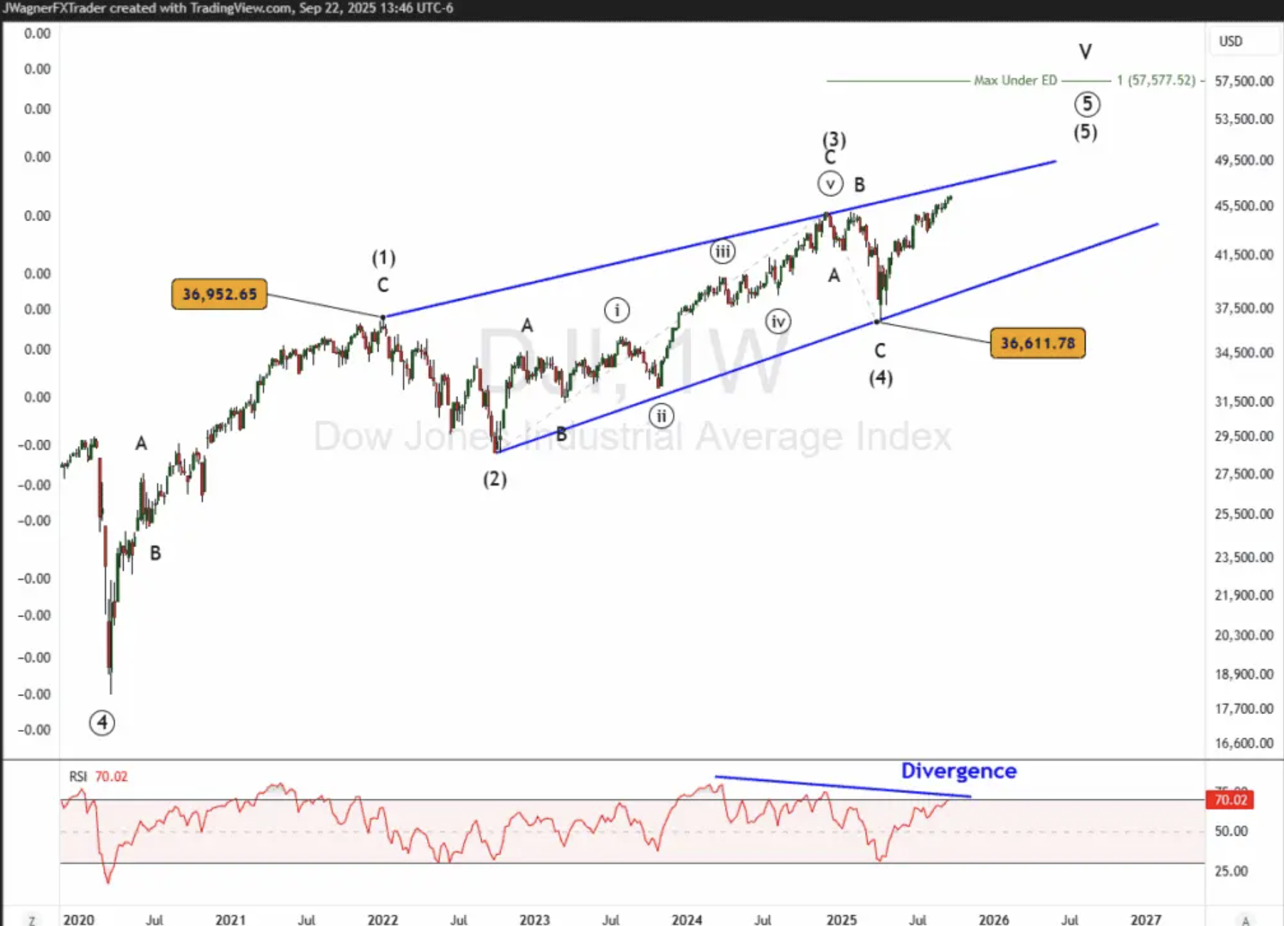 Primary wave ((5)) began in 2020 and has rallied in an ending diagonal shape. An ending diagonal takes the shape of a rising wedge in traditional technical analysis. Within the ending diagonal, prices would rally in 5 waves. It appears wave (4) of ((5)) completed at the April 2025 low. Therefore, the rally since April is wave (5) of ((5)).