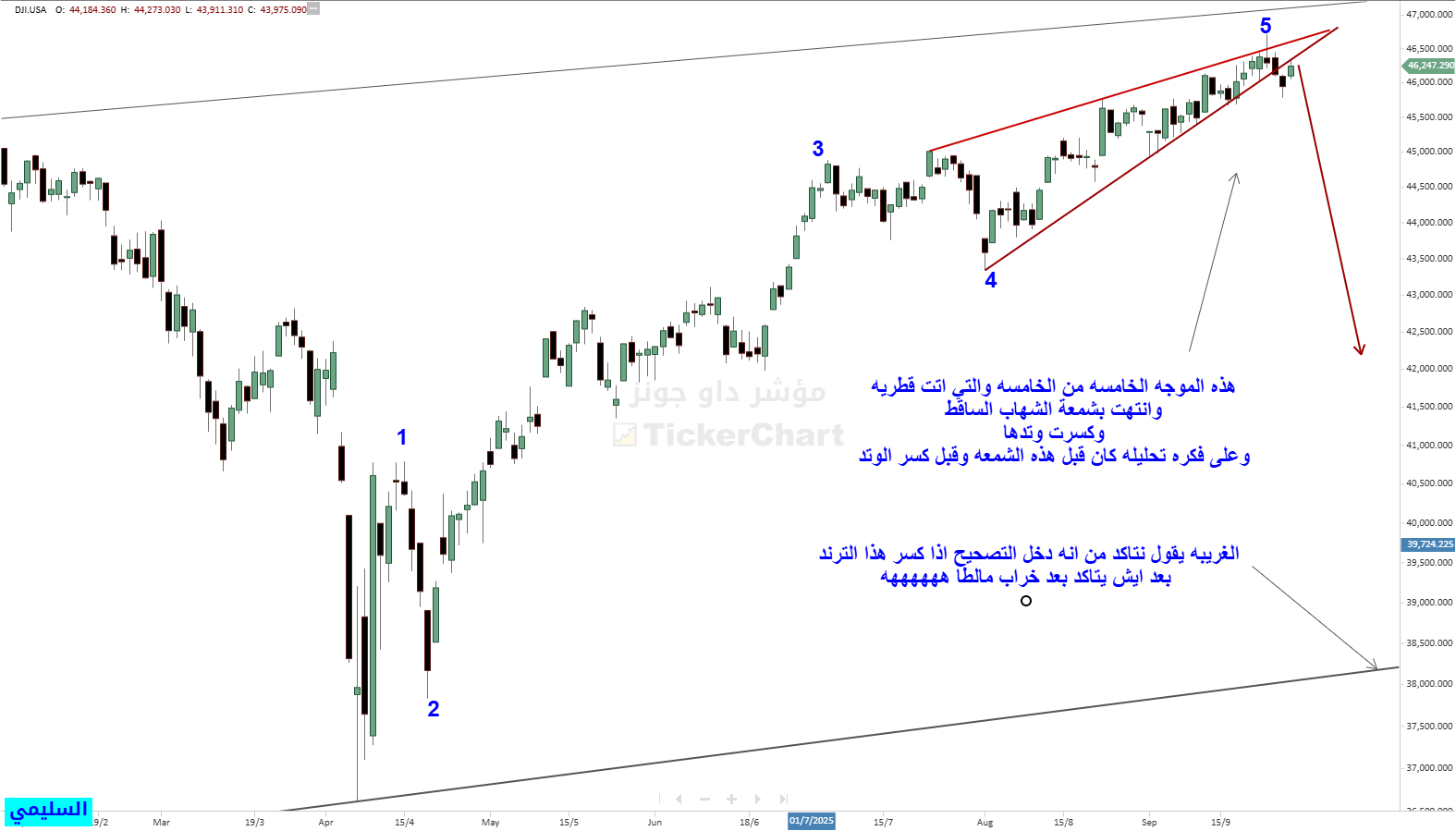 الموجه الحاليه يبدو انها الموجه 5 من 5 هذا كلامه ( وهو بذلك يثبت ان الداو انتهت موجته لان الخامسه من الخامسه ما بعدها الا التصحيح