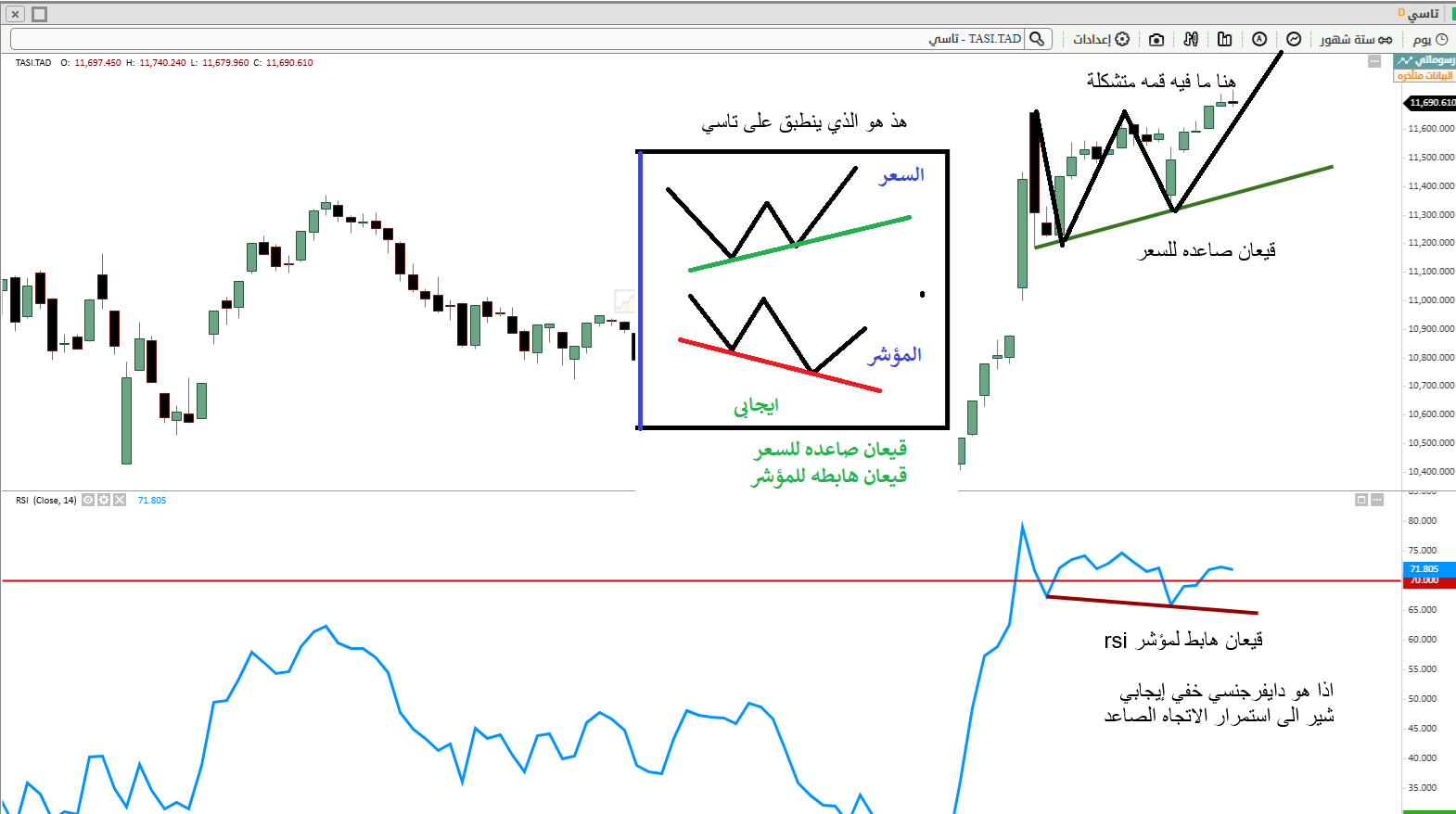 الذي ينطبق هو قيعان صاعده للسعر يقابله قيعان هابطه لـ RSI