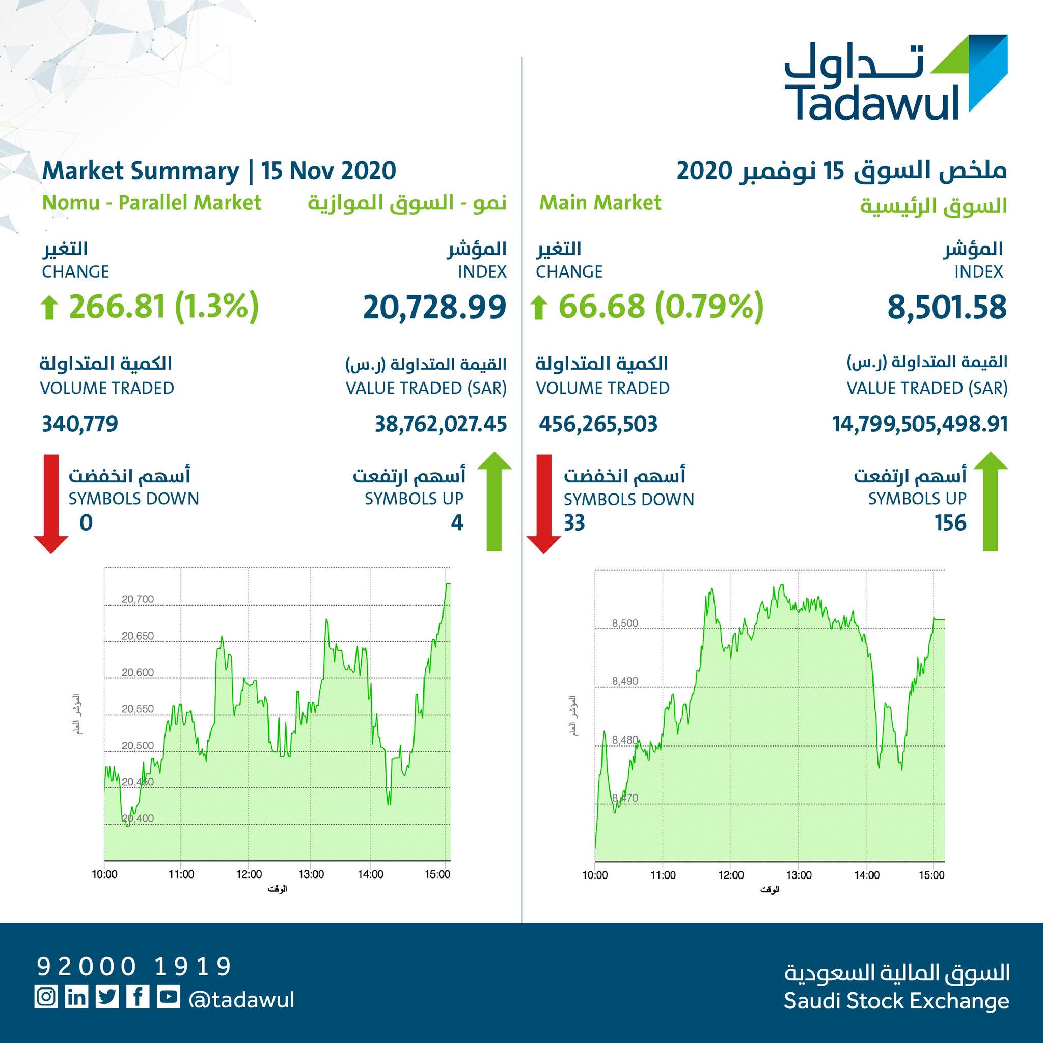 ملخص السوق المالية لهذا اليوم الأحد 15 نوفمبر 2020 :