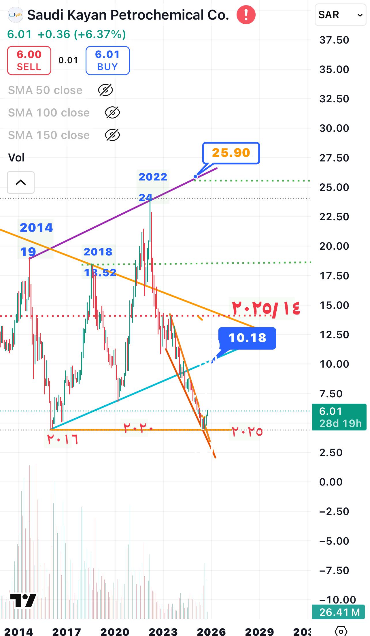 بعدها المفروض القاع يكون في 2024 لكنه كسر القناة الصاعدة حينها