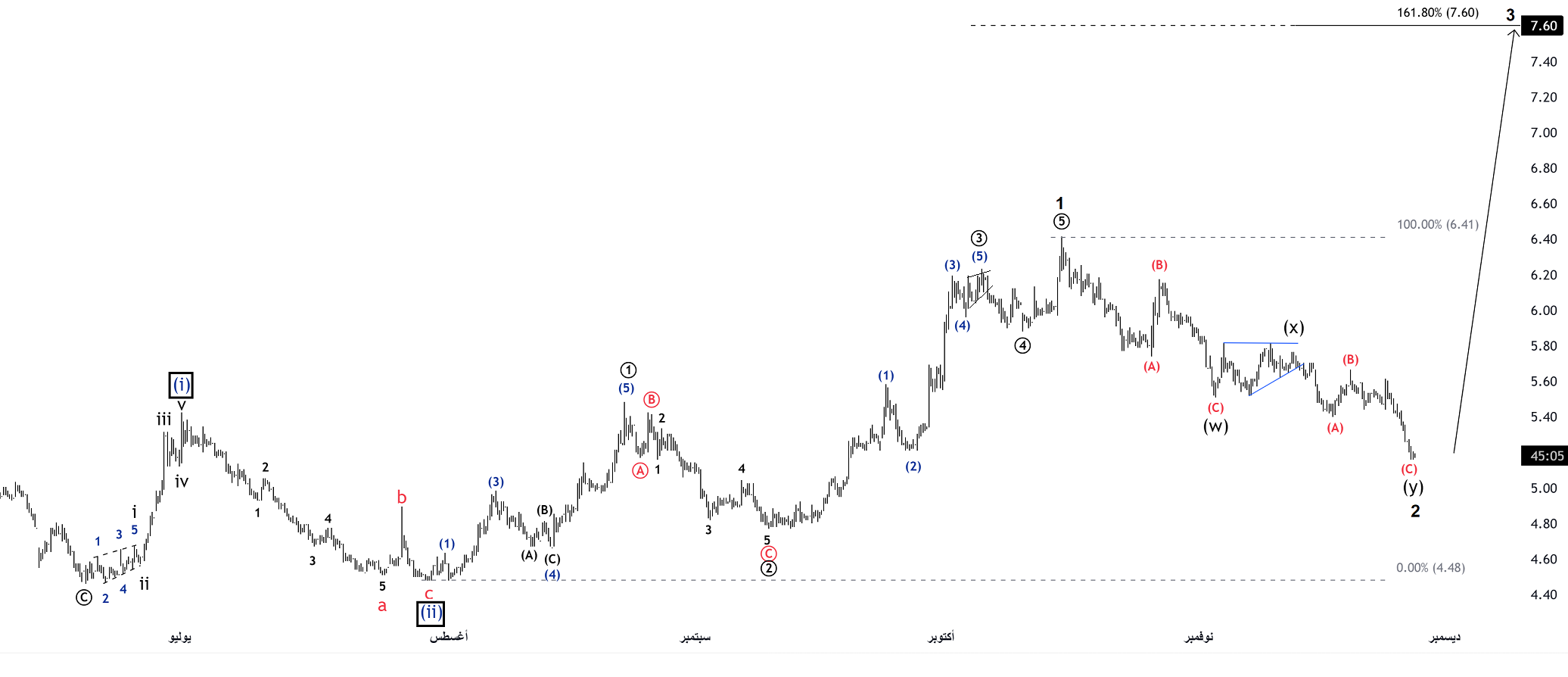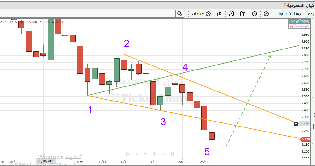 جلست امس احاول ابحث وادقق في موجات سهم كيان على فاصل ربع ساعه والحمدالله وجدت السهم بناءً على تقديرات موجات اليوت الى الان يعتبر السهم جيد واتجاهه صاعد, والهبوط الذي حصل الان للسهم اعطى له هدف اعلى مما سبق الى هدف 7.60 , الفشل هو كسر 4.48 .