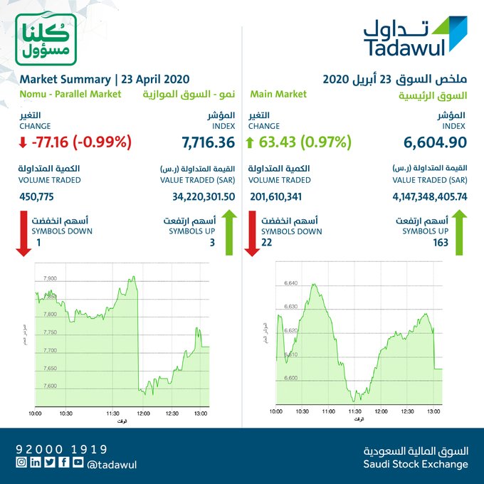 ملخص السوق المالية لهذا اليوم الخميس 23 أبريل 2020 :