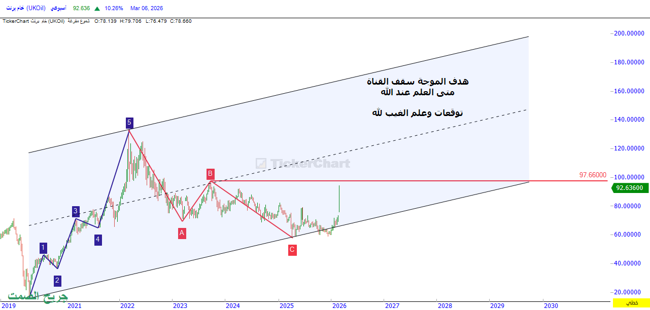 وماأتوقعة بالفترة الحالية والله اعلم بأن بأن نشاهد قمم جديدة فوق المستوى الحالي 93 دولار