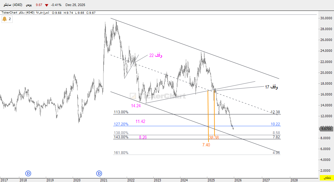 السهم بشكل عام على الحركه الاخيره خارج الخدمه من عام 2022 شهر 4 بنموذج سلبي من وقف 22 واهداف بالوردي موضحه