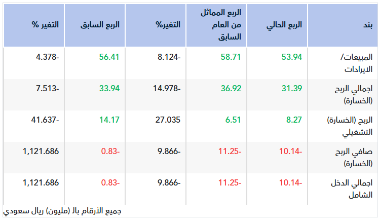 حققت الشركة صافي خسارة قدرها 10.14 مليون ريال خلال الربع الثاني من عام 2025م مقارنة بصافي خسارة قدرها 11.25 مليون ريال خلال الربع المماثل من العام السابق، ويعود السبب الرئيسي في انخفاض الخسارة الى ارتفاع الربح التشغيلي بنسبة 27 % نتيجة انخفاض حصة المجموعة في خسائر الشركات الشقيقة مقارنة بالربع المماثل، وكذلك انخفاض مخصص الانخفاض في ذمم مديني عقود الايجار التشغيلي.