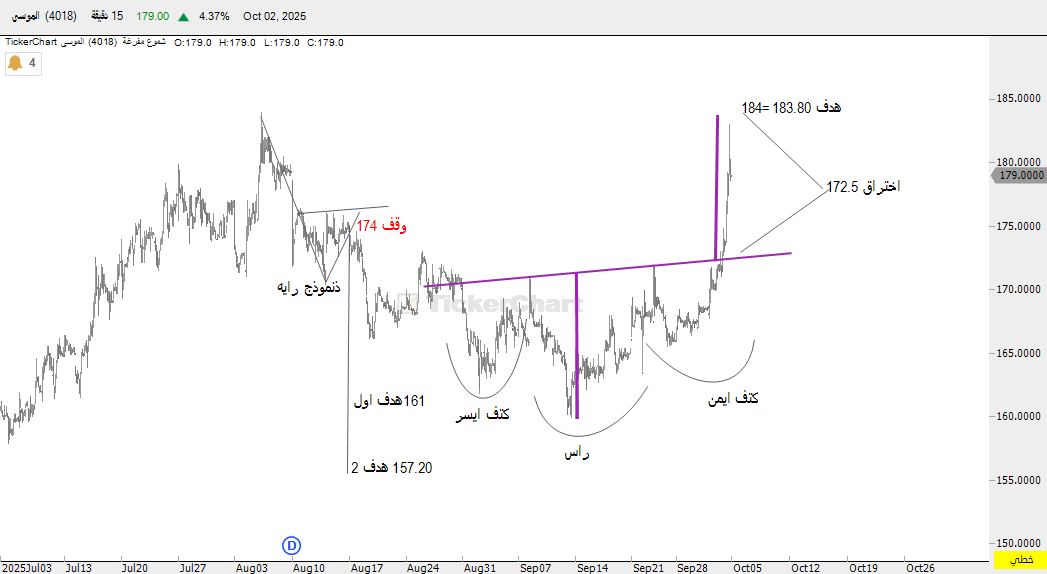 وبالعوده كون السهم نموذج كتفين وراس باختراق واضح للنموذج عند 172 والهدف 184 وصل الاعلى 183
