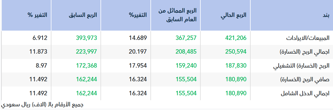 • ونتيجة لذلك، ارتفع إجمالي الربح التشغيلي للشركة بنسبة18 % ليصل إلى 187.8 مليون ريال سعودي، مقارنةً بـ 159.2 مليون ريال سعودي للربع المماثل من العام السابق.