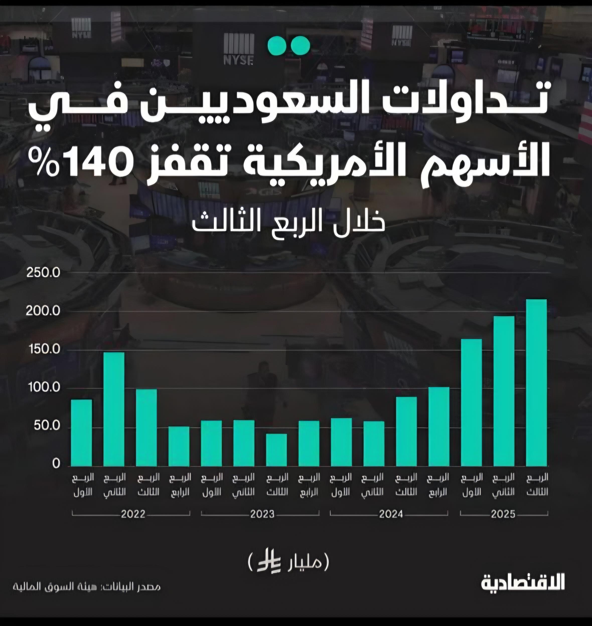 التداولات من السعودية في السوق الأمريكية تواصل تسجيل مستويات قياسية وتتجاوز 216 مليار ريال