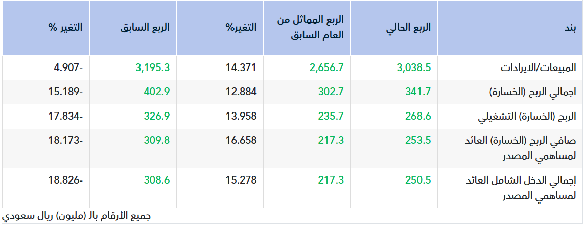 - ط¹ظ„ظ‰ ط§ظ„ط±ط؛ظ… ظ…ظ† ط§ظ†ط®ظپط§ط¶ ط§ظ„ظ…ط¨ظٹط¹ط§طھ ط¨ظ†ط³ط¨ط© 4.9% ط¥ظ„ط§ ط£ظ† ط§ط¬ظ…ط§ظ„ظٹ ط§ظ„ط±ط¨ط­ ط´ظ‡ط¯ ط§ظ†ط®ظپط§ط¶ط§ ط£ظƒط¨ط± ط­ظٹط« ط¨ظ„ط؛طھ ظ†ط³ط¨ط© ط§ظ„ط§ظ†ط®ظپط§ط¶ 15.2% ظˆط±ط¬ط¹ ط°ظ„ظƒ ط¨طµظˆط±ط© ط±ط¦ظٹط³ظٹط© ط§ظ„ظ‰ ط§ظ„ط§ظ†ط®ظپط§ط¶ ط§ظ„ظ†ط³ط¨ظٹ ظ„ظ‡ط§ظ…ط´ ط§ظ„ط±ط¨ط­ظٹط© ط¹ظ„ظ‰ ظ…ط¨ظٹط¹ط§طھ ط¨ط¹ط¶ ط§ظ„ط£ظ‚ط³ط§ظ… ظ…ظ‚ط§ط±ظ†ط© ط¨ط§ظ„ط±ط¨ط¹ ط§ظ„ط³ط§ط¨ظ‚. ظˆط¹ظ„ظ‰ ط§ظ„ط±ط؛ظ… ظ…ظ† ط£ظ† ظ…طµط±ظˆظپط§طھ ط§ظ„ط¨ظٹط¹ ظˆط§ظ„طھط³ظˆظٹظ‚ ظˆط§ظ„ظ…طµط±ظˆظپط§طھ ط§ظ„ط¹ظ…ظˆظ…ظٹط© ظˆط§ظ„ط¥ط¯ط§ط±ظٹط©طŒ ط¥ظ„ظ‰ ط¬ط§ظ†ط¨ ط§ظ„ظ…طµط±ظˆظپط§طھ ط؛ظٹط± ط§ظ„طھط´ط؛ظٹظ„ظٹط© (ط¨ط¹ط¯ ط®طµظ… ط§ظ„ط¥ظٹط±ط§ط¯ط§طھ ط§ظ„ط£ط®ط±ظ‰)طŒ ظ‚ط¯ ط§ظ†ط®ظپط¶طھ ظپظٹ ظ…ط¬ظ…ظˆط¹ظ‡ط§طŒ ط¥ظ„ط§ ط£ظ†ظ‡ط§ ظ…ط«ظ„طھ ظ†ط³ط¨ط© ط£ط¹ظ„ظ‰ ظƒظ†ط³ط¨ط© ظ…ظ† ط¥ط¬ظ…ط§ظ„ظٹ ط§ظ„ط±ط¨ط­ ظ…ظ‚ط§ط±ظ†ط© ط¨ط§ظ„ط±ط¨ط¹ ط§ظ„ط³ط§ط¨ظ‚طŒ ظ…ظ…ط§ ط£ط¯ظ‰ ط¥ظ„ظ‰ ط§ظ†ط®ظپط§ط¶ ط£ظƒط¨ط± ظپظٹ طµط§ظپظٹ ط§ظ„ط±ط¨ط­ ظ…ظ‚ط§ط±ظ†ط© ط¨ط§ظ„ط§ظ†ط®ظپط§ط¶ ظپظٹ ط§ط¬ظ…ط§ظ„ظٹ ط§ظ„ط±ط¨ط­ ط­ظٹط« ط¨ظ„ط؛ ط§ظ„ط§ظ†ط®ظپط§ط¶ 18.2%.