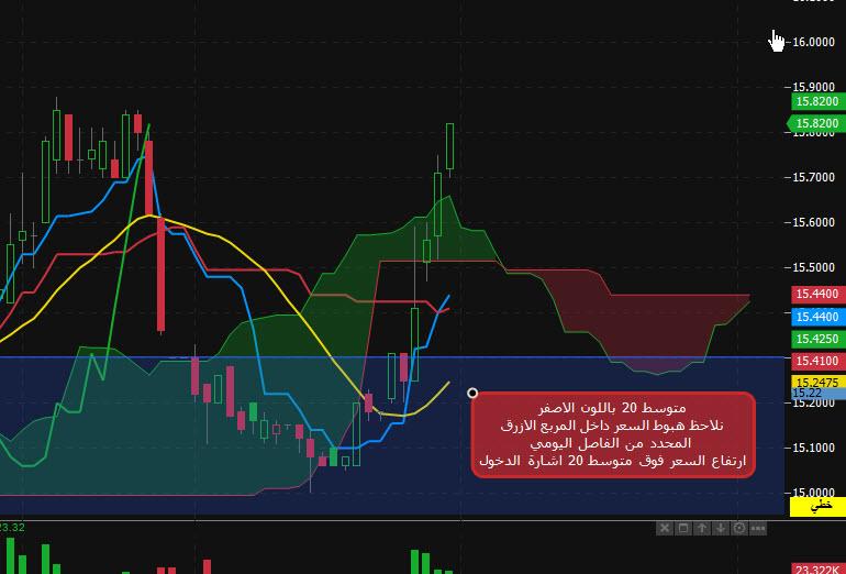 انتظار ارتفاع السعر فوق متوسط 20 يوم وهي اشارة الدخول عند سعر 15.31 والهدف ضعفين المنطقة عند 15.85 او اي وسيلة اخري تراها لتحقيق الهدف