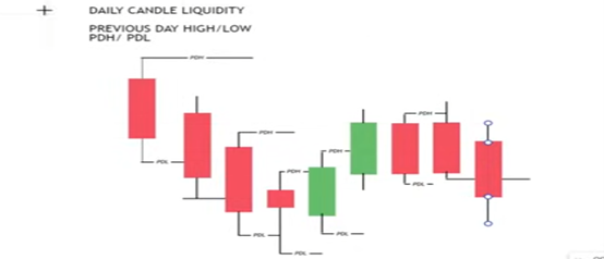 • نأخذ الشمعة الطبيعة بافتراضها شمعة حمراء لها ذيول علوية وسفليه وافتتاح واغلاق ونضع PDH وهي اعلي اتجاه يومي وPDL ادني اتجاه يومي ونضع فيهما خط
