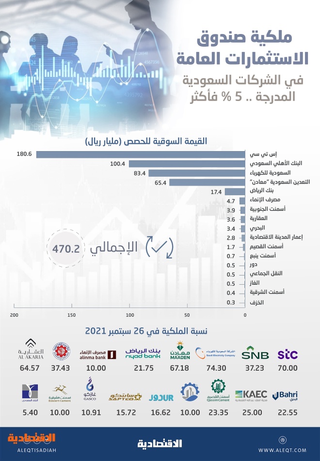 بلغت القيمة السوقية للمحفظة الاستثمارية لصندوق الاستثمارات العامة في سوق الأسهم السعودية 470.2 مليار ريال، حسب إغلاق 26 سبتمبر الجاري.