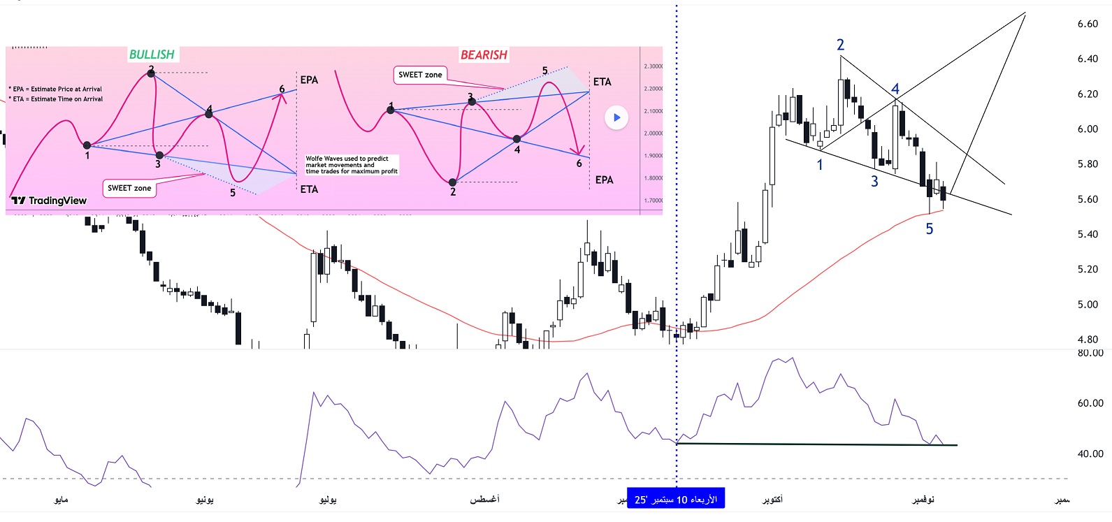 على كل حال سهم كيان شكل نموذج وولف او نموذج الذئب وهو نمط ايجابي صاعد ومعطي هدف تقريبا فوق قمته السابقة والسهم باذن في اتجاه صاعد وعنده دايفرجنس ايجابي