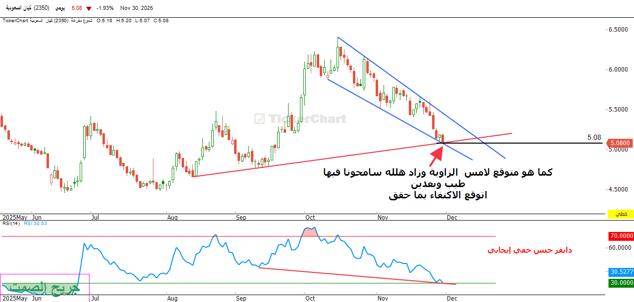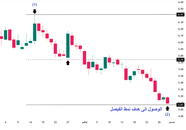 في الصوره الاولى السهم وصل الى سعر 5.07 وهذا يعتبر هدف نمط الفيصل , والمعروف ان نمط الفيصل هو نمط اكتشفه المحلل السعودي الاستاذ اسماعيل الشكري . ومن اراد الاستزاده الذهاب الى قناته في اليوتيوب خاصة فيه.