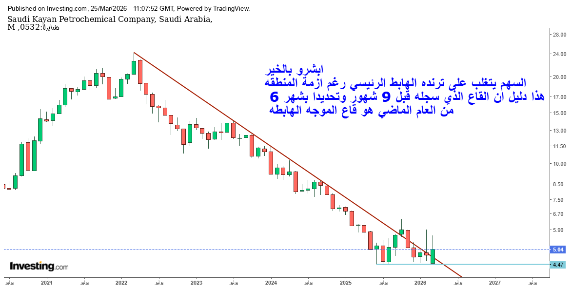 لا املك بيانات خط سيره من بداية تداوله عام 2007 والتي بدأت شمعته ب سعر 12 ريال واغلقت بسعر 26 ريال وكان الأعلى فيها 29 وشوي والأدنى 11 وشوي