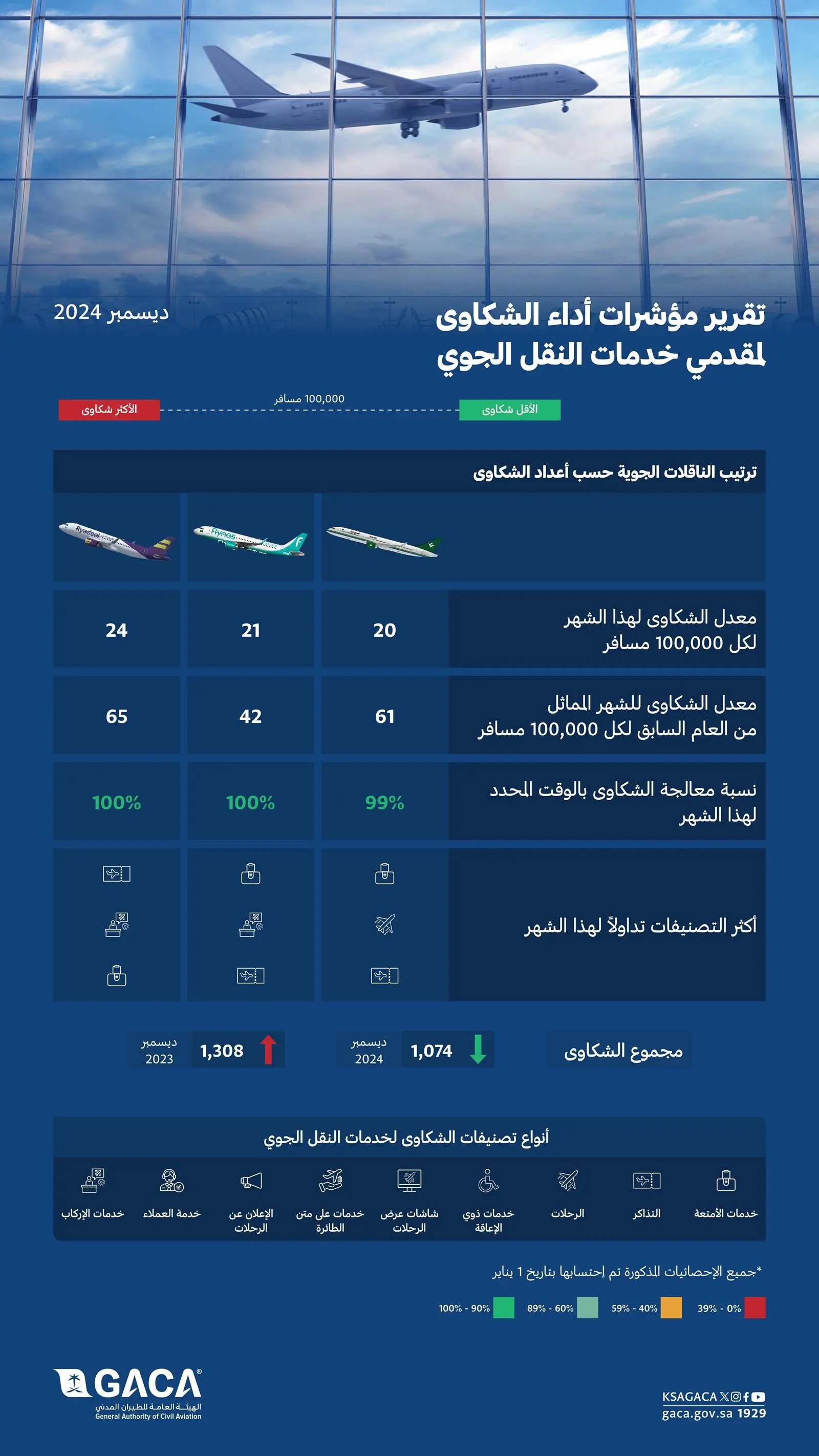 أصدرت الهيئة العامة للطيران المدني اليوم، مؤشر تصنيف مقدمي خدمات النقل الجوي والمطارات، من واقع عدد الشكاوى المرفوعة من المسافرين للهيئة خلال شهر ديسمبر 2024.