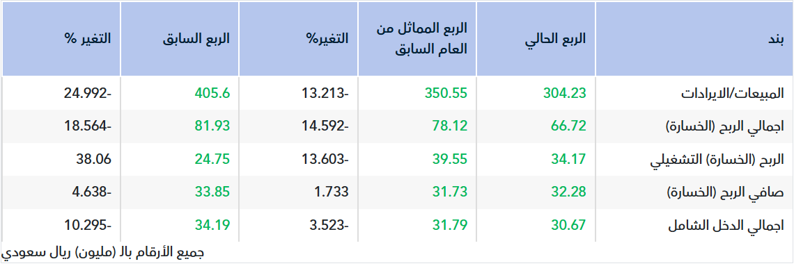 ط³ط¬ظ„طھ ط§ظ„ط´ط±ظƒط© ط¥ظٹط±ط§ط¯ط§طھ ظ…ط¨ظٹط¹ط§طھ ظ‚ط¯ط±ظ‡ط§ 304.23 ظ…ظ„ظٹظˆظ† ط±ظٹط§ظ„ ط³ط¹ظˆط¯ظٹ ظپظٹ ط§ظ„ط±ط¨ط¹ ط§ظ„طط§ظ„ظٹ ظ…ظ‚ط§ط±ظ†ط© ط¨ظ€ 405.60 ظ…ظ„ظٹظˆظ† ط±ظٹط§ظ„ ط³ط¹ظˆط¯ظٹ ظپظٹ ط§ظ„ط±ط¨ط¹ ط§ظ„ط³ط§ط¨ظ‚.