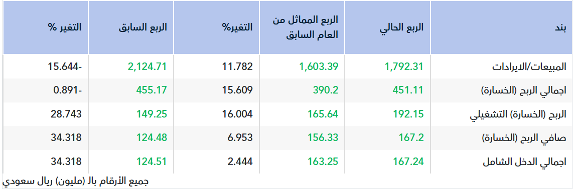 سجلت الشركة خلال هذا الربع صافي ربح قدره 167.2 مليون ريال سعودي، مقارنة بـ 124.5 مليون ريال سعودي في الربع السابق، ويعزى هذا الارتفاع إلى تحسن هامش إجمالي الربح، وانخفاض المصاريف العمومية والإدارية، إضافةً إلى تحسن في مخصصات الخسائر الائتمانية المتوقعة.